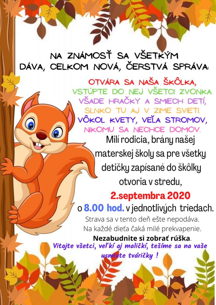 Oznamujeme rodičom, že nástup detí do materskej školy vo Varhaňovciach je dňa 2.9.2020 o 8.00hod. TEŠÍME SA NA VÁS ! :)